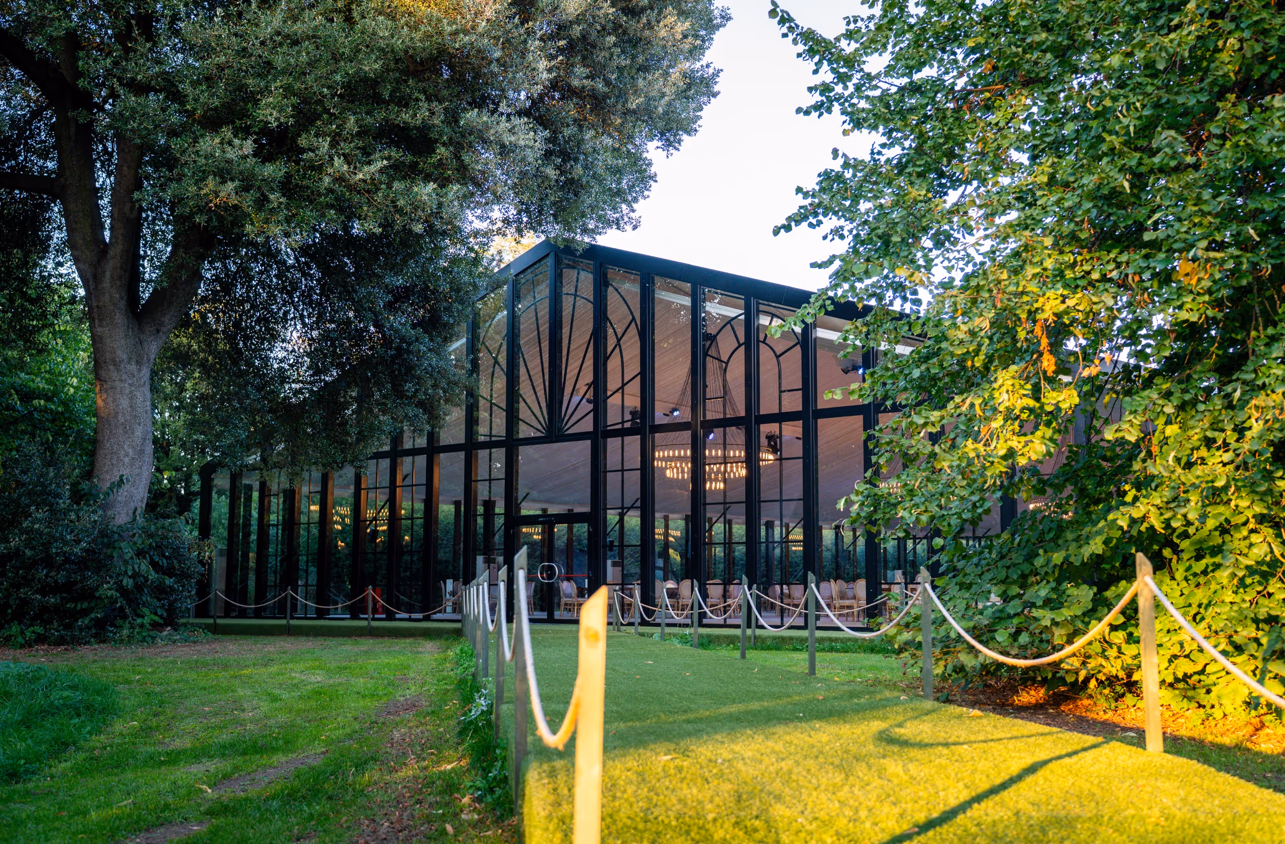 Yes. The estate offers several distinct ceremony options: a partitioned space within the Glass House for a grand indoor setting, a relaxed intimate ceremony in the Walled Garden, or an open-air or dedicated marquee ceremony on the Wilderness Lawn for larger wedding productions. After the ceremony, guests flow naturally into reception drinks on the lawns, dining in the Glass House, and evening celebrations — all within the one private plot. Every space connects, making the transitions between moments seamless.